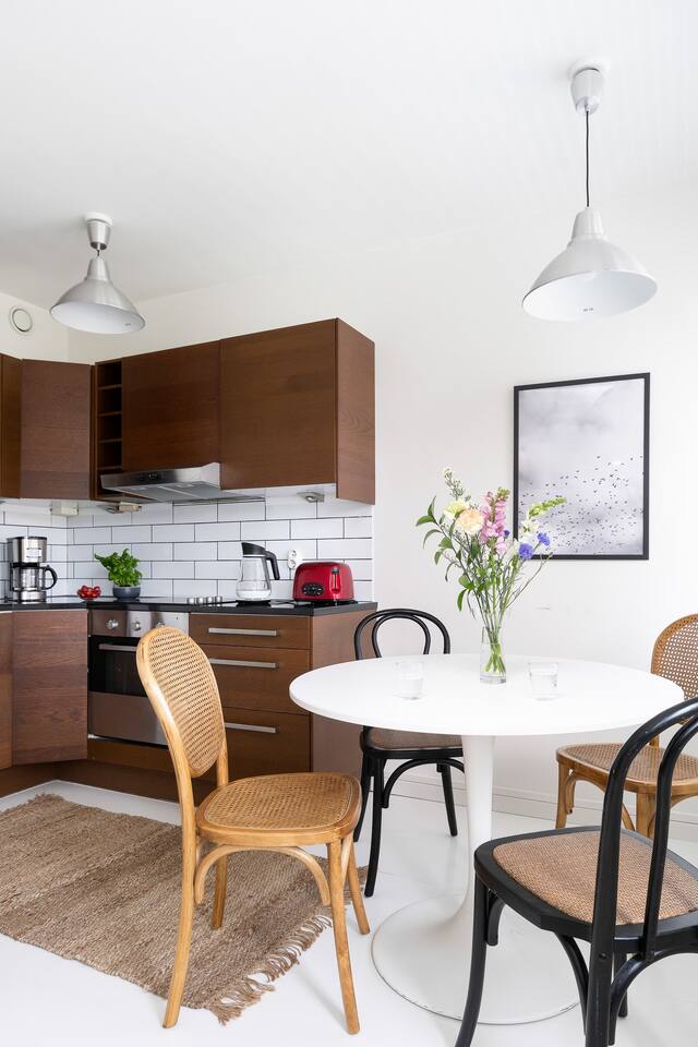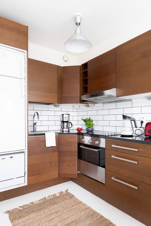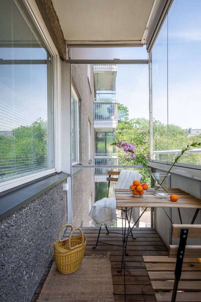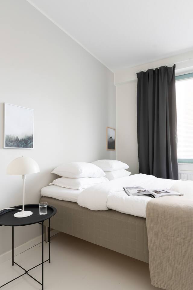 The apartment is 45 sqm, with a separate bedroom and kitchen/living room. There is a double bed (160cm) and a pull-out sofa bed (140cm) with an additional foam mattress to ensure a cosy sleep. The windows are facing the backyard, so the apartment is very peaceful and quiet. In the kitchen: Cooking utensils and dinnerware for 6 Electric kettle and coffee maker Complimentary tea bags and coffee powder Microwave and toaster 4 hob stove and oven Dining table and 4 chairs Living room: Queen size foam mattress topper on sofa-bed, sheets, duvet and pillows to comfortably sleep 2 people Dark blinds to keep out the midnight sun 43 inch full-HD TV with Netflix Access to balcony with park views Bedroom: 160cm double bed with foam mattress Premium sheets for a good night’s sleep Dark blinds to keep out the midnight sun Closet with both drawers & hangers for your use Adjustable height office table and chair Bathroom: Rain-shower head for luxurious showers Washing machine with complimentary detergent Complimentary salon quality shower gel, shampoo & conditioner Premium hair dryer for fast drying Luxurious hotel quality bath towels Ironing board and iron Other amenities: Blazing fast WiFi - 100 Mbps fibre-optic connection Multiple plug points for charging Additional keys available upon request Baby items upon request