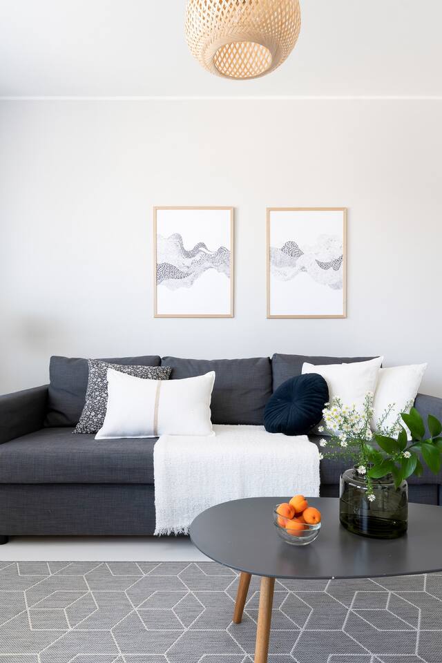 This is the most convenient location in town. Located in a transport hub, you have access to the metro (3min walk), a range of buses, including a direct bus to the airport (615), and tram lines. The center of town is a 5 min metro ride, 10 min tram ride, or a 30 min walk away. Or why not hop on one of the city bikes and take the scenic seaside route! Also accessible by car, free parking for 1 vehicle in the garage in the same building.